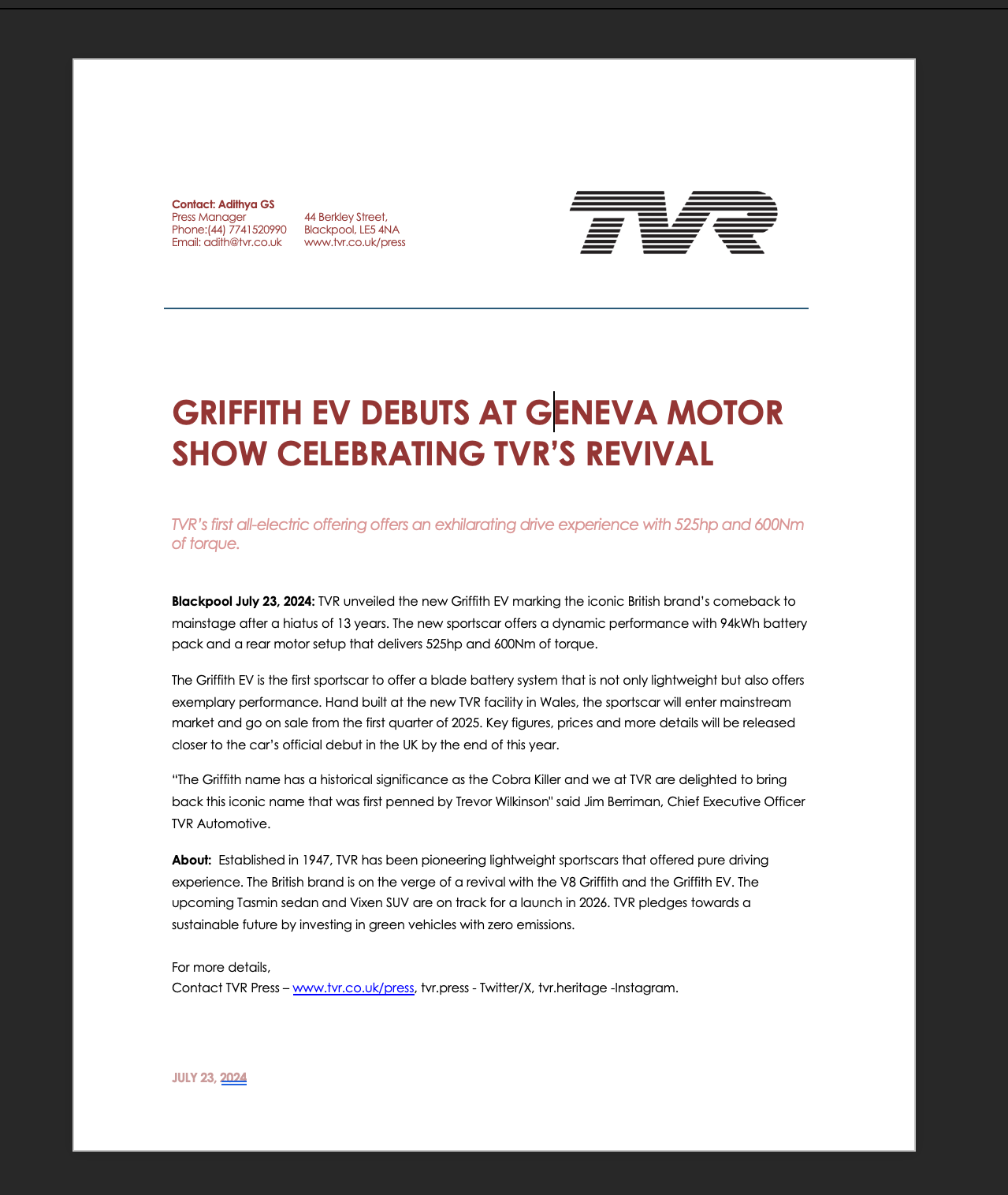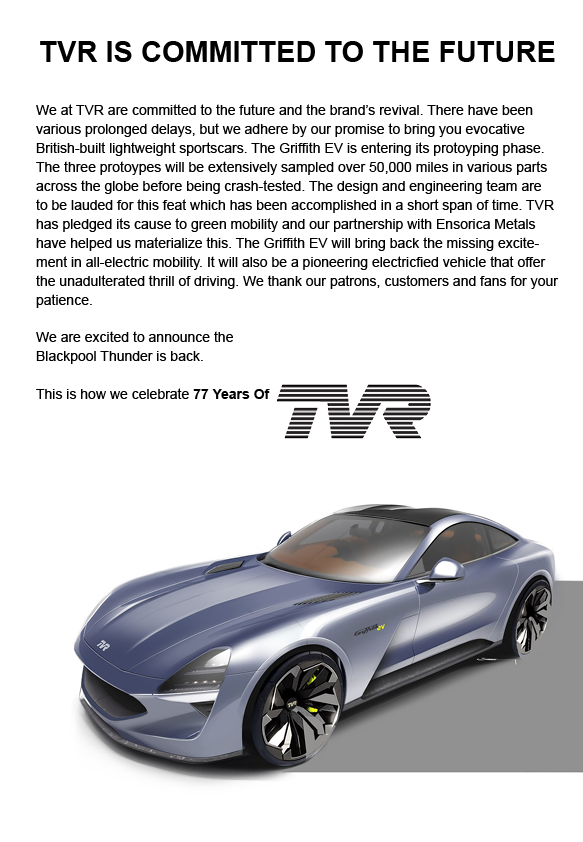 Press kit developed as a part of TVR's image revival PR campaign plan. Extensive research and a situation analysis highlighted the importance of an immediate image restoration PR campaign for the British brand.